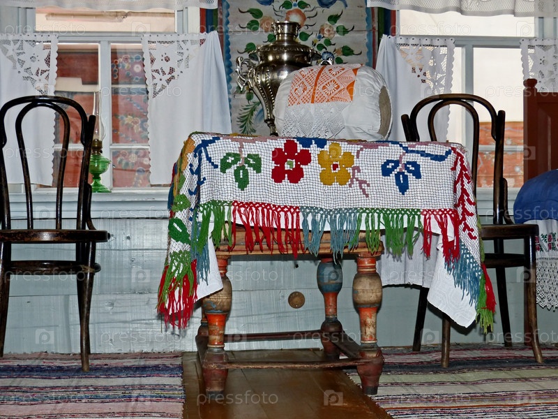 Горница. "Чистая (белая)" часть крестьянского дома. Уральская роспись – участие народный промысел. Музей-заповедник деревянного зодчества и народного творчества. Нижняя Синячиха, Россия