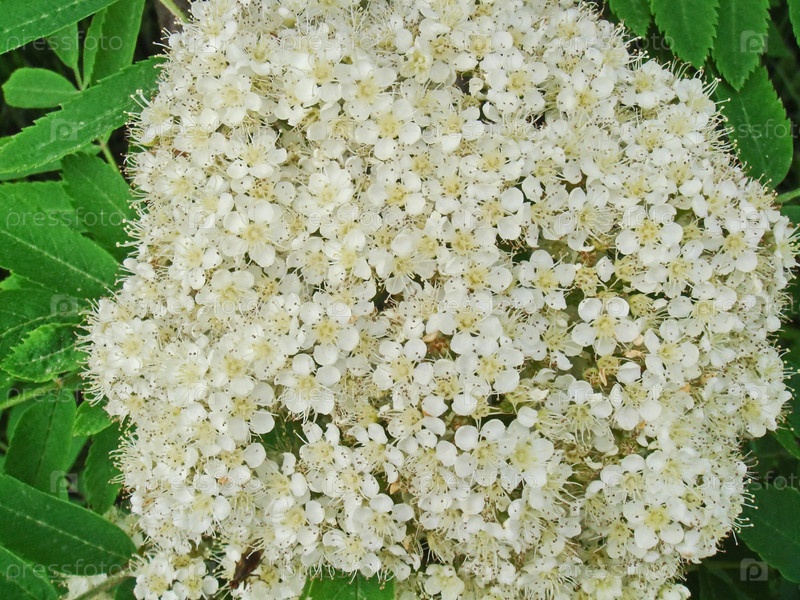 Цветы обыкновенной рябины. Многочисленные белые цветки рябины собраны в плотные щитковидные соцветия на концах ветвей