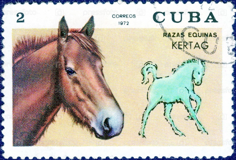 Куба, около 1972 года: почтовая марка с изображением лошади и надписью ''Razas Equinas. Kertag'' из серии 'Конные гонки'