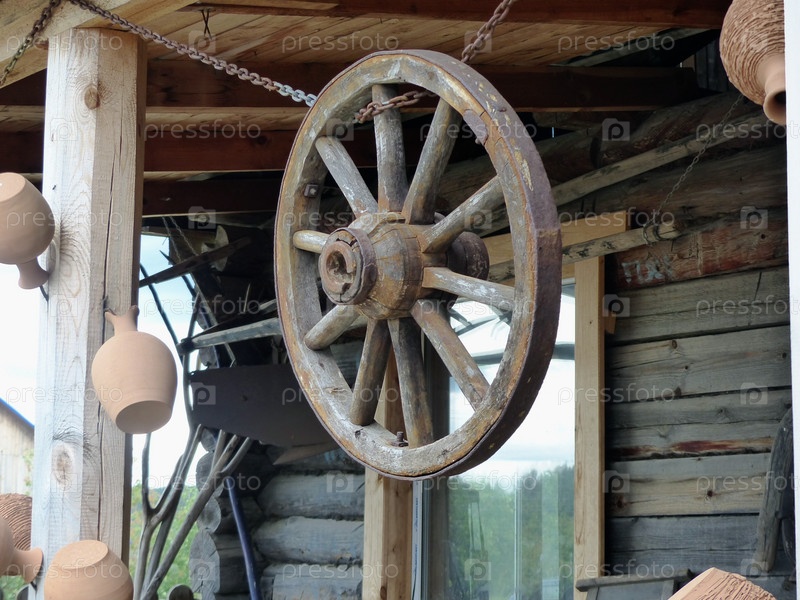 Старое колесо от телеги, висит под крышей мастерской. Ретро. Крупным планом