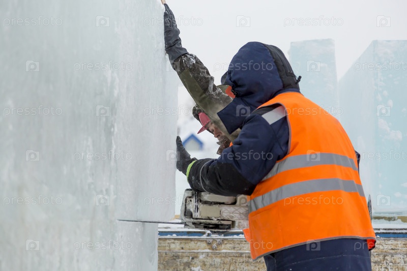 Портрет слесаря в оранжевом жилете с бензопилой в руках