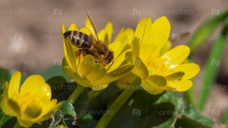 Пчела собирает пыльцу на макрофото маленьких желтых цветов. Медоносная пчела опыляет весенние первоцветы крупным планом