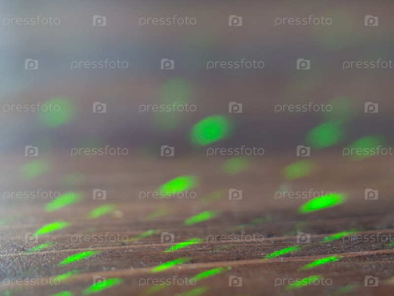 Абстрактный праздничный фон для дизайна. Несфокусированные зеленые круги боке на темном деревянном фоне. Вспышка объектива подсвечивается свечением