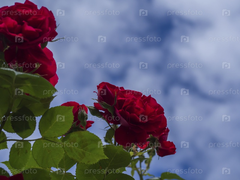 Расплывчатая летняя цветочная карта. Цветы красной розы с зелеными листьями на фоне голубого неба с белыми облаками