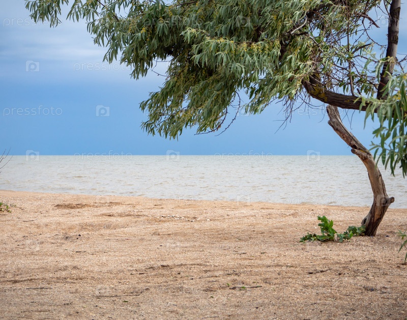 Дерево на пляже, песок на переднем плане, море и небо на заднем плане