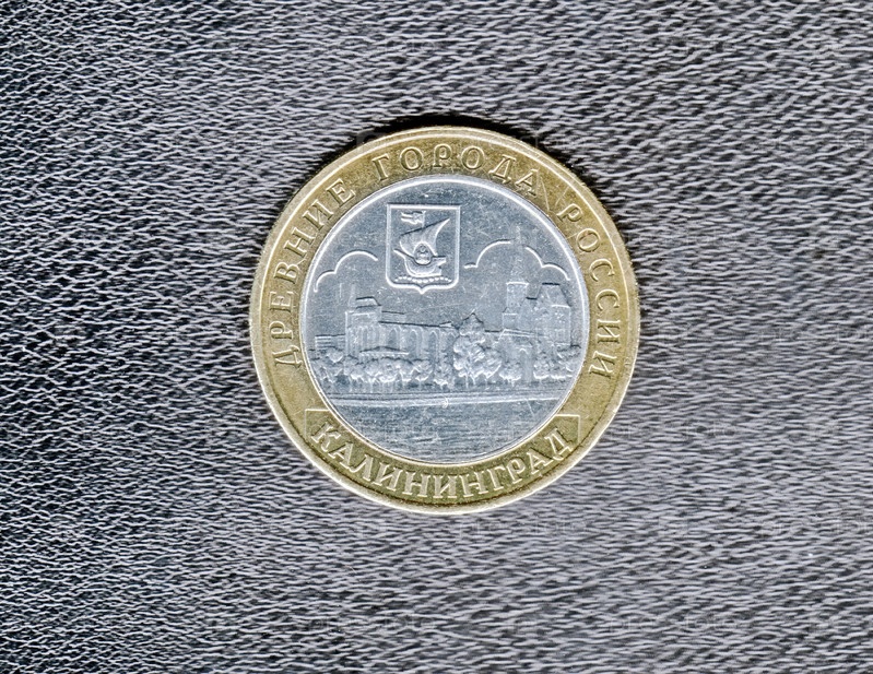 Памятная монета номиналом 10 рублей (аверс) с изображением панорамы, герба города и надписью «Древние города России, Калининград», изолировано на темном фоне