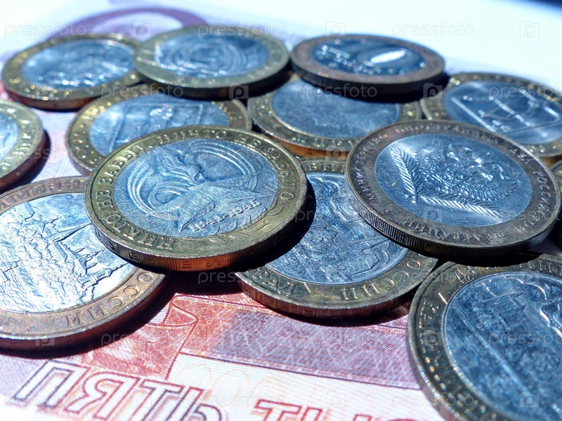 Российские памятные 10 рублевые монеты и бумажная банкнота. Нумизматика. Фон с денежными знаками