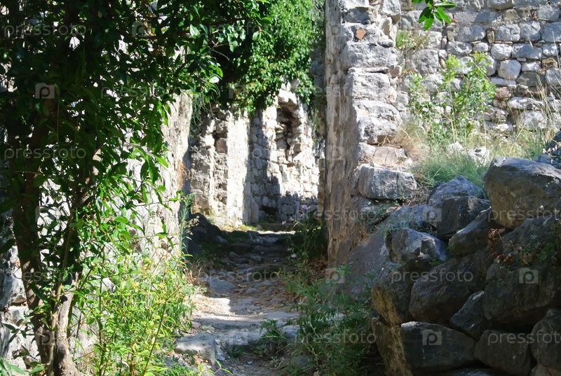 Руины зданий в крепости Старый Бар (Stary Bar). Крепость в старом городе в солнечный летний день. Очень посещаемое место туристов. Черногория