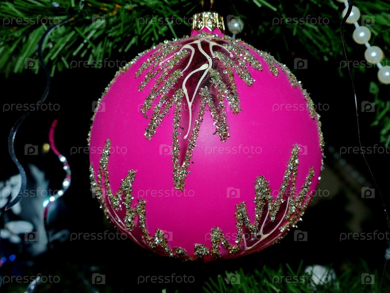Новогодние игрушки на ветках елки. Стеклянный шар, бусы. Праздничный фон. Новый год и Рождество. Выборочный фокус