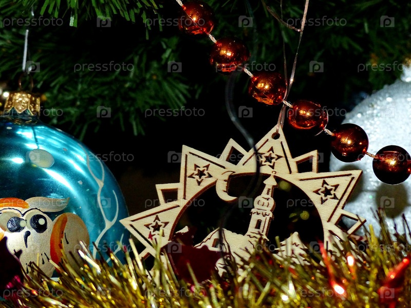 Новогодние игрушки на ветках елки. Стеклянный шар, бусы. Праздничный фон. Новый год и Рождество. Выборочный фокус