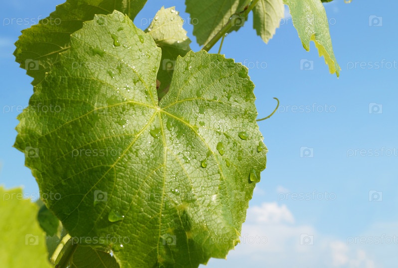 Зеленая ветвь виноградной лозы на фоне голубого неба