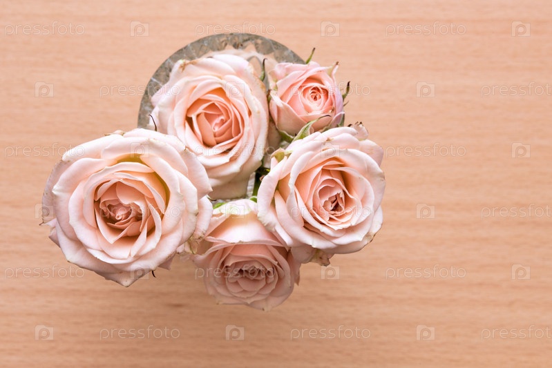 Розовые розы в вазе на деревянном столе