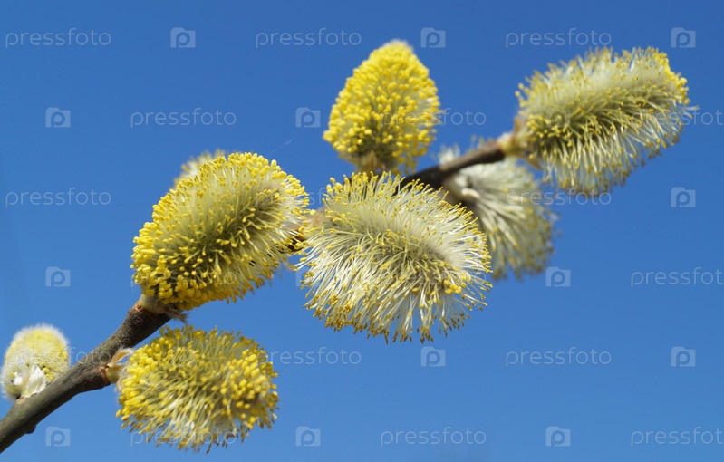 Ветка цветущей ольхи на фоне голубого неба