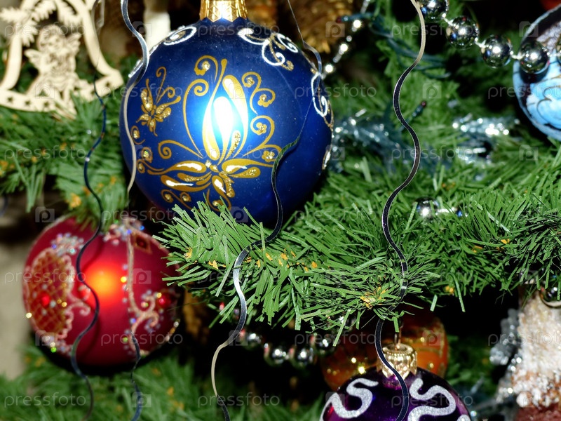 Новогодние игрушки на ветках елки. Стеклянные шар, бусы. Праздничный фон. Новый год и Рождество. Выборочный фокус