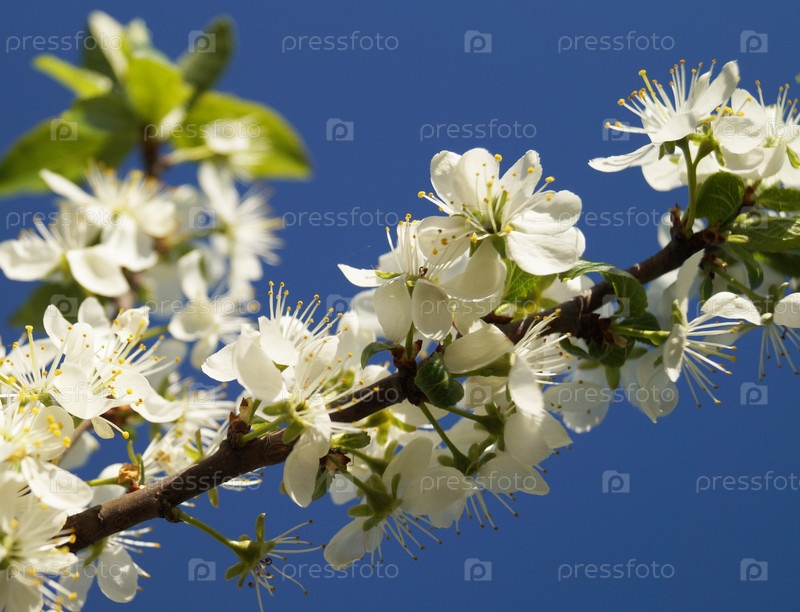 Ветка с цветом от белого лепестка на фоне голубого неба