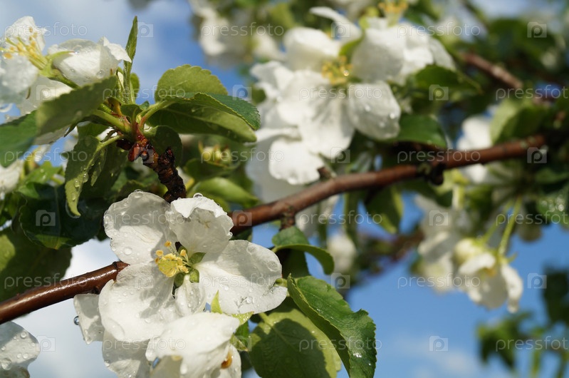Весеннее цветение яблоням в саду после дождя