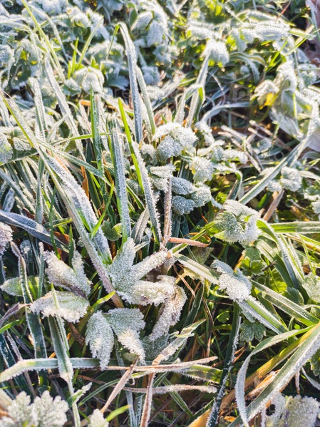 Утренний иней на зеленых листьях травы. Первые заморозки осенью. Поздняя осень в лесу