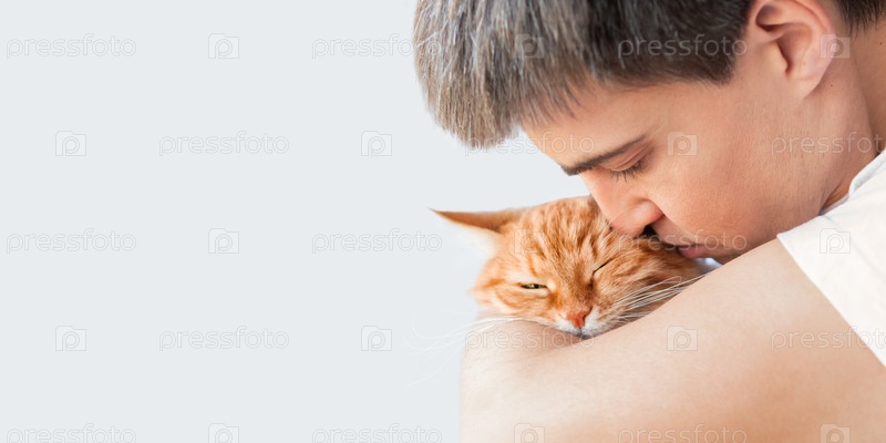 Крупный план портрета кавказца, обнимающего милую рыжую кошку. Нежные отношения с пушистым питомцем и его хозяином. Скопируйте пространство на белом фоне
