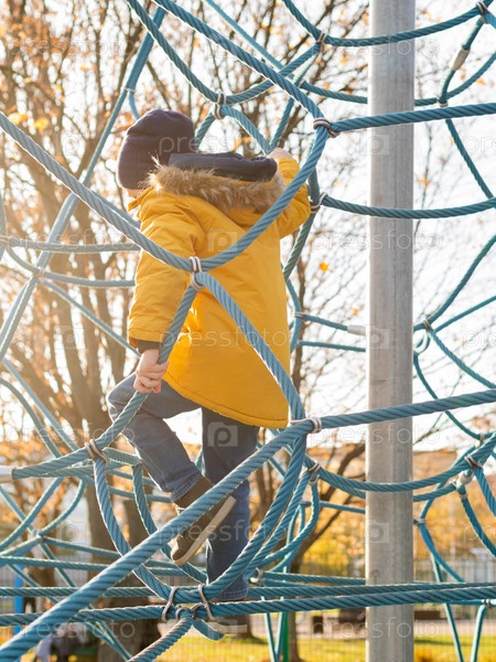 Маленький мальчик играет на детской площадке. Малыш взбирается по веревочной конструкции на спортивной площадке. Досуг в солнечный осенний день. Осенний сезон в городе
