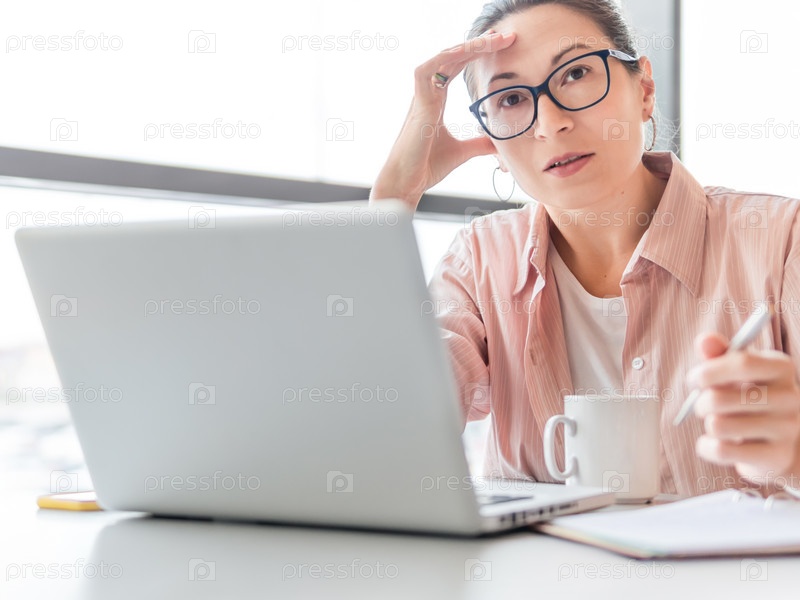 Серьезная женщина в очках работает с ноутбуком и рукописными заметками в блокноте. Современный офис с панорамными окнами в коворкинг-центре. Рабочее место для фрилансеров или студентов в бизнес-центре