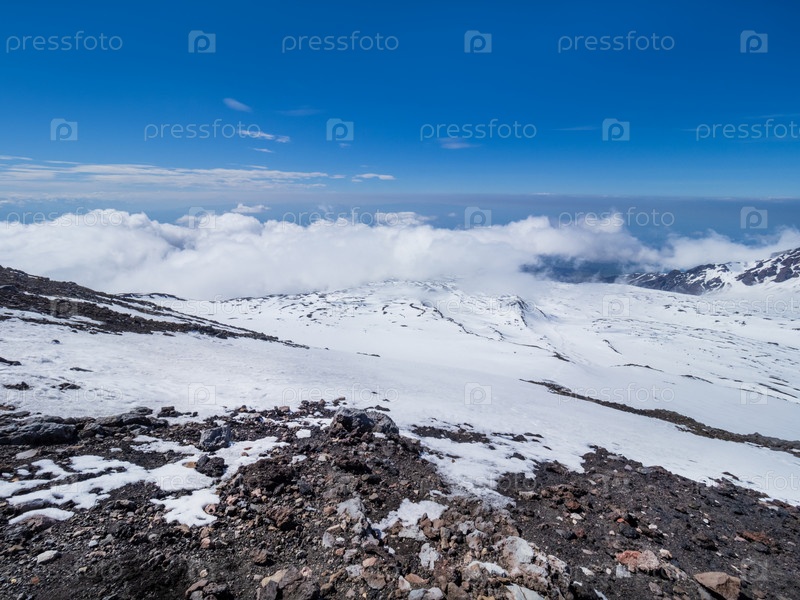 Панорама стратовулкана Плоский Толбачик. Вершины гор покрыты снегом в хорошую погоду с ясным небом. Пешие прогулки по полуострову Камчатка, Россия