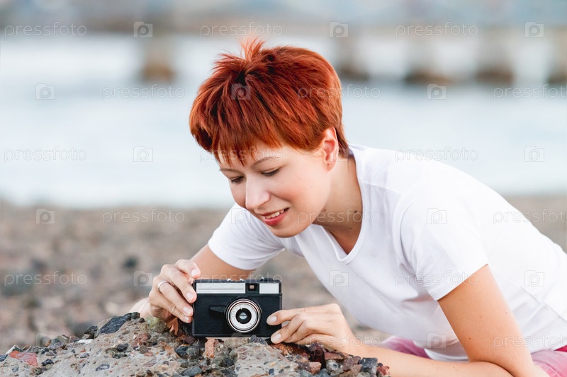 Женщина с короткими рыжими волосами снимает на винтажную пленочную камеру. Фотография как хобби. Ретро-камера с ручным объективом