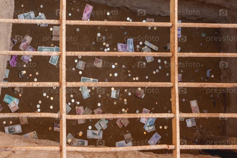 Различные монеты и банкноты в яме под железными прутьями. Туристы хотят оставить деньги в Великой пирамиде как ритуал на удачу или пожертвование. Великая пирамида в Гизе, Египет