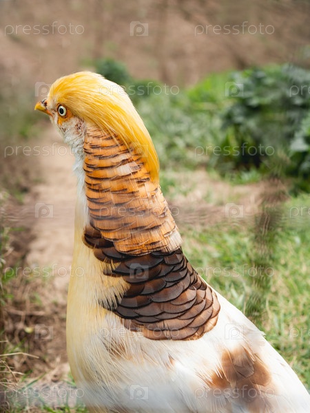Золотой фазан или Chrysolophus pictus, также известный как китайский фазан. яркая птица с желтыми перьями в траве