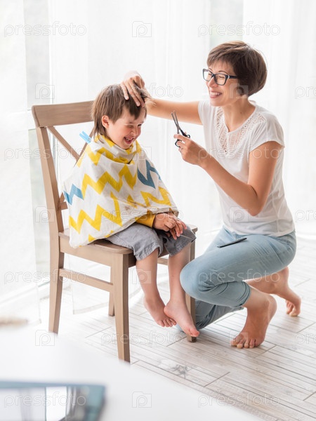 Мать сама подстригает сына. Маленький мальчик сидит, покрытый тканью, и держит ножницы. Красота в домашнем образе жизни