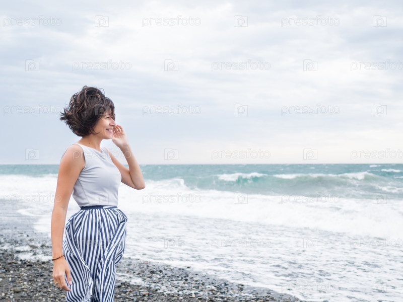 Счастливая женщина приветствует бурное море на галечном пляже. Женщина с растрепанными ветром волосами. Концепция страсти к путешествиям. Отдых на берегу моря