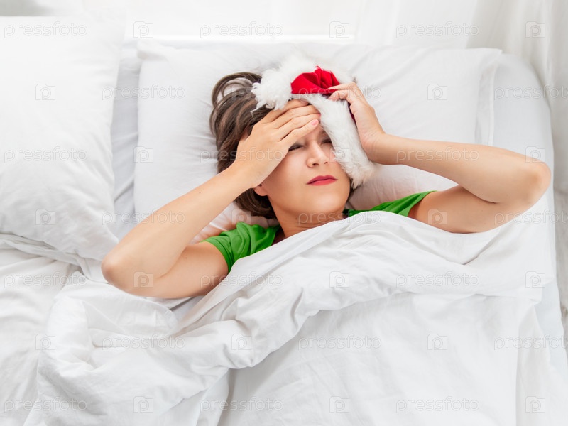 Женщина в шляпе Санты просыпается после рождественской вечеринки. У нее болит голова после празднования Нового года. Раннее тяжелое утро. Отказ от алкоголя. Худшее похмелье