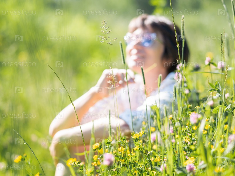 Размытый фон с женщиной в солнечных очках. Женщина наслаждается солнечным светом и цветочным ароматом на травяном поле. Летние вибрации. Расслабьтесь на свежем воздухе. самоуспокаивающий