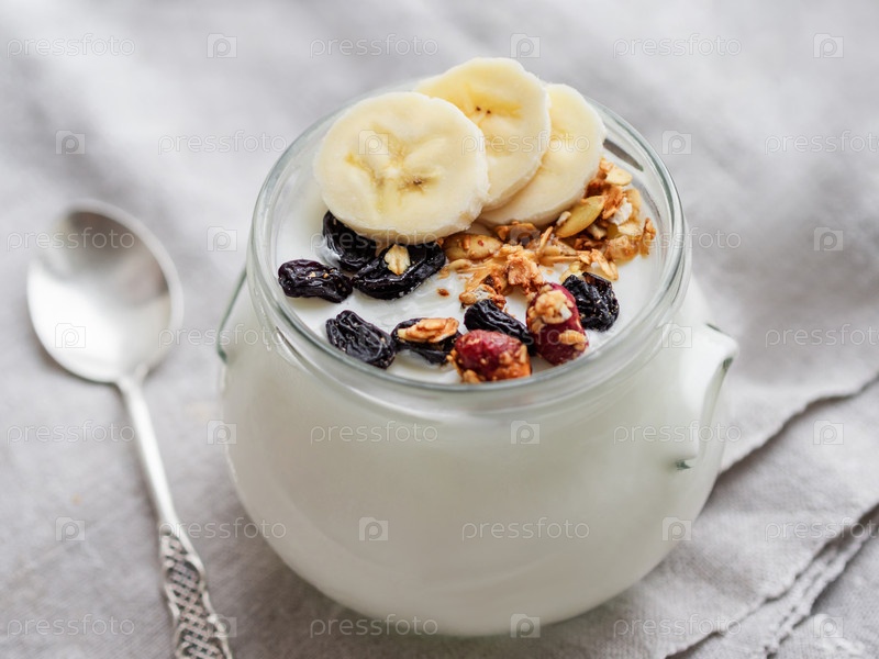 Натуральный домашний йогурт в стеклянной банке. Здоровая еда на завтрак с мюсли. Баночка с мюсли и кусочками банана на льняной скатерти на льняной салфетке