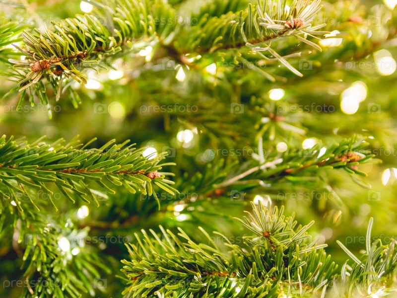 Рождественская елка с лампочками. Натуральная хвойная елка, украшенная к празднованию Нового года. Праздничная иллюминация