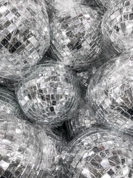 Продажа маленьких диско-шаров в полиэтиленовых пакетах для елки. Декоративные зеркальные шары для празднования Нового года в магазине. Праздничный шоппинг. Монохромный фон