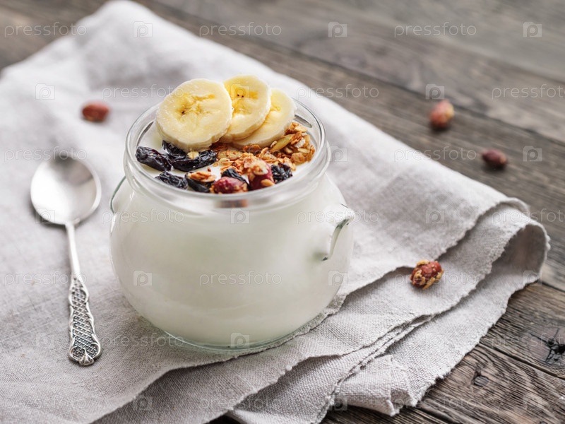 Натуральный домашний йогурт в стеклянной банке. Здоровая еда на завтрак с мюсли. Баночка с мюсли и кусочками банана на льняной скатерти на деревянном столе