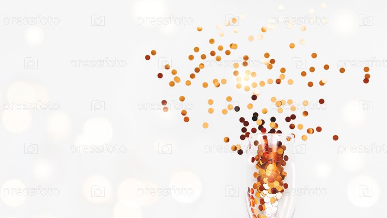 Вид сверху на прозрачный бокал с взорвавшимся фейерверком из золотых блесток. Праздничное пространство для копирования с посудой на белом фоне с лампочками