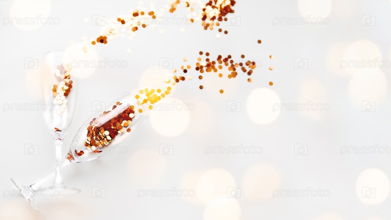 Два прозрачных бокала с золотыми блестками. Праздничное пространство для копирования с посудой на белом фоне. Символ праздника и фейерверков на горизонтальном фоне