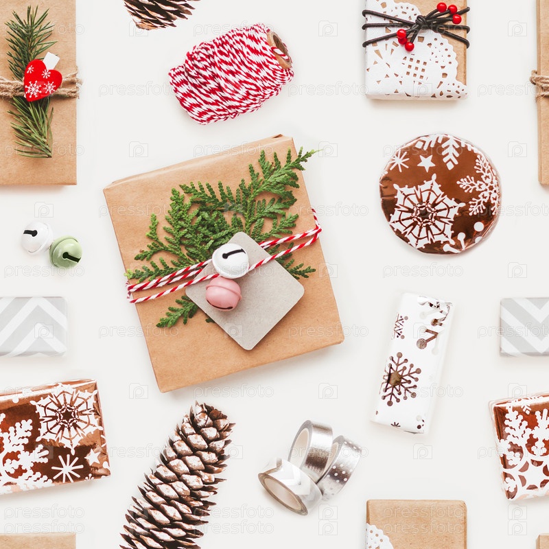 Фото бесшовный фон с рождественскими подарками и новогодними украшениями. Вид сверху на подарочные коробки из крафтовой и яркой бумаги с разноцветными колокольчиками, нитками и ветками сосны