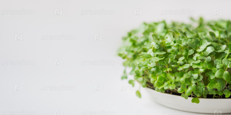 Горизонтальный баннер с микро-зеленью и копировальным пространством. Выращивание микрорастений дома для здоровья или веганского питания. Проращивание семян в домашних условиях