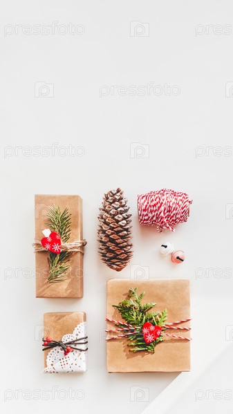 Рождественские подарки своими руками, завернутые в крафт-бумагу, с еловыми веточками и красными сердечками. Вид сверху на украшения на новогодних подарках. Праздничный фон. Дух зимнего праздника. Баннер с копией пространства
