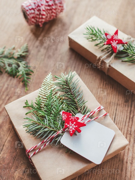 Рождественские подарки своими руками, завернутые в крафт-бумагу с еловыми ветками. Красные украшения в форме елки, звезды. Новогодние подарки на деревянном фоне. Дух зимнего праздника