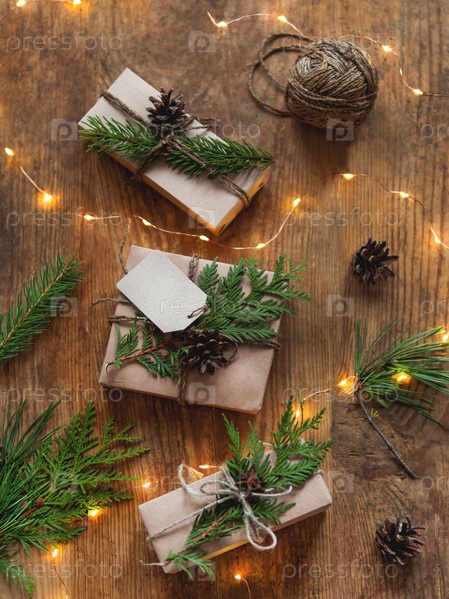 Рождественские подарки, завернутые в крафт-бумагу, с украшением из натуральной ели и веток туи. Вид сверху на деревянный стол с новогодними подарками ручной работы