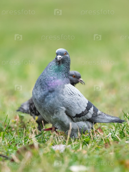 Портрет двух голубей крупным планом с поверхности земли. Городские птицы ищут еду на лужайке с зеленой травой