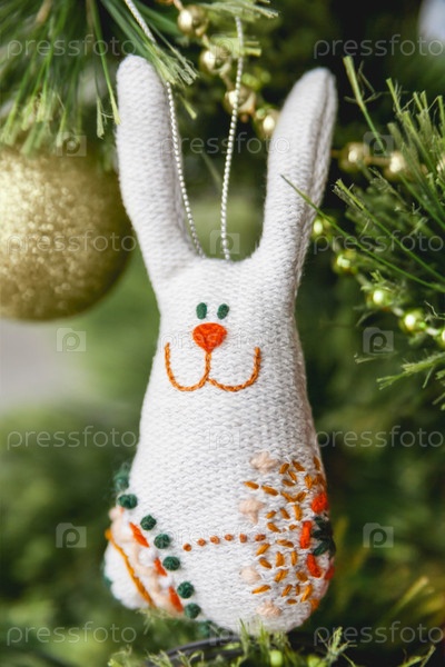 Кролик из ткани ручной работы в качестве украшения на елку. Вышитый заяц как символ Нового 2023 года
