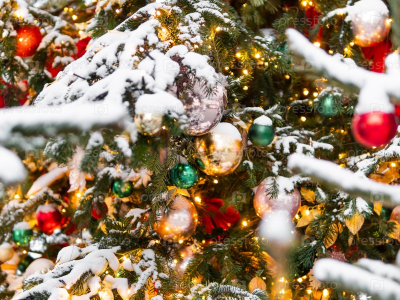 Рождественская елка с уличными украшениями. Елка, украшенная разноцветными шарами и лампочками для празднования Нового года