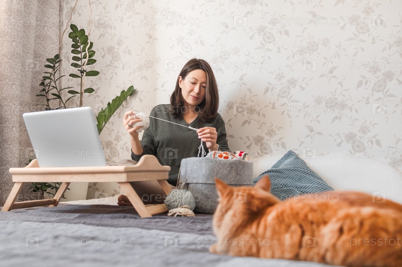 Рыжая кошка смотрит, как женщина вяжет крючком, смотря фильм на ноутбуке. Учитесь вязать по видео урокам в интернете. Уютный дом и антистрессовое хобби
