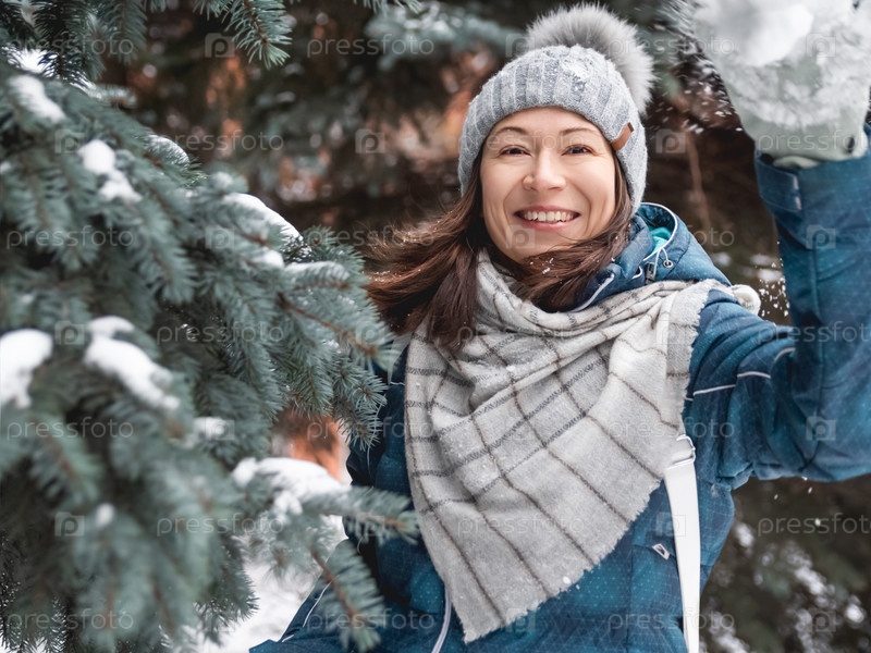 Улыбающаяся женщина в вязаной шапке играет со снегом. Веселье в парке между заснеженными елями. Женщина смеется, бросая снежок. Холодный сезон