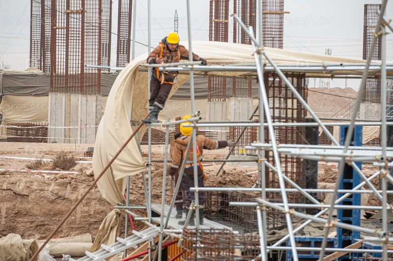 Рабочие со специальным оборудованием на строительной площадке делают опалубку