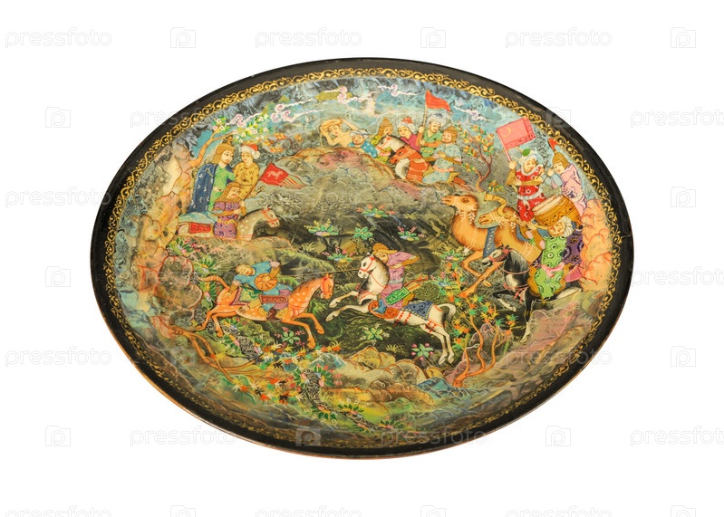 Вид сверху на восточную керамическую тарелку с изображением сцены войны на белом фоне, Узбекистан